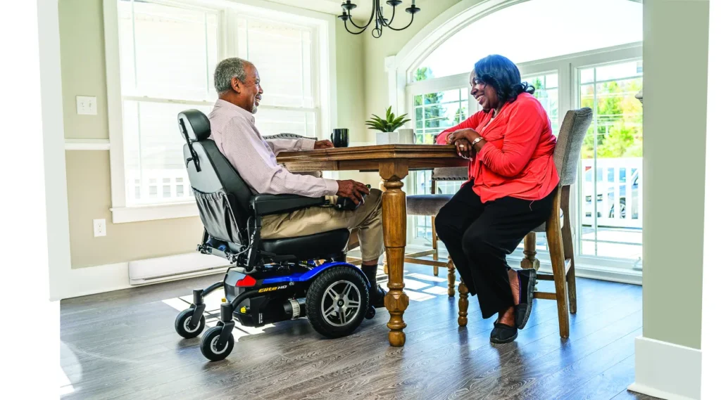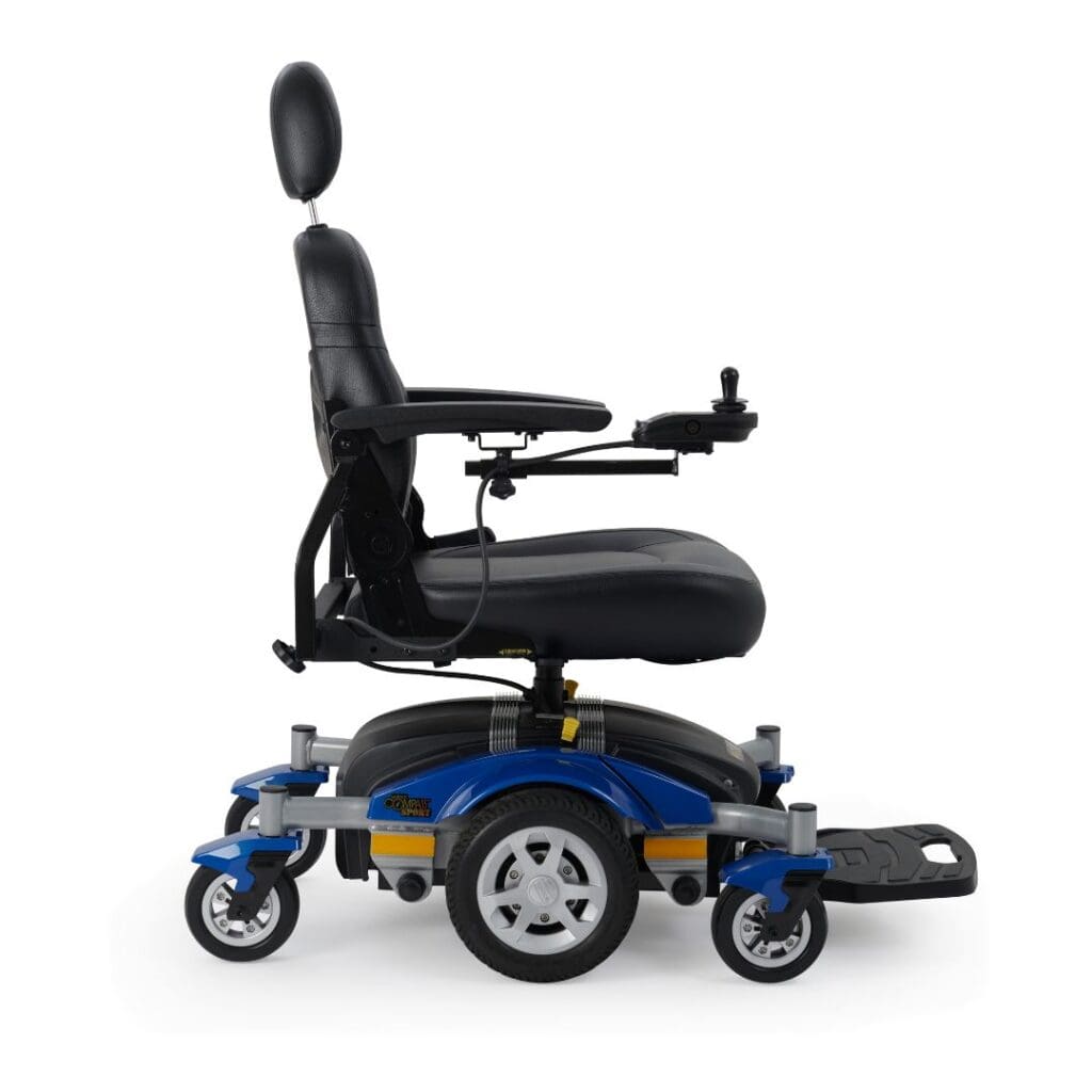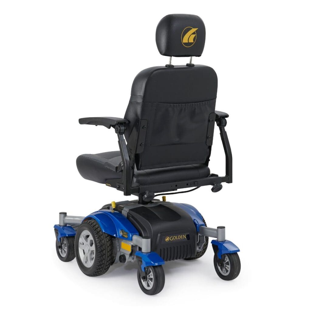 The Golden Compass™ Sport GP605 power wheelchair delivers sporty style, advanced technology, and everyday maneuverability for both indoor and outdoor use. Designed with durable solid-color injection molded shrouds in vibrant red or blue, the Compass Sport combines modern aesthetics with long-lasting performance. Built on a center-wheel drive platform, the Compass Sport offers exceptional turning ability and smooth handling in tight spaces. Its springless articulating chassis, paired with the Dynamic LiNX® controller featuring patented Dynamic Load Compensation Technology, improves terrain climbing and creates a more natural driving experience.